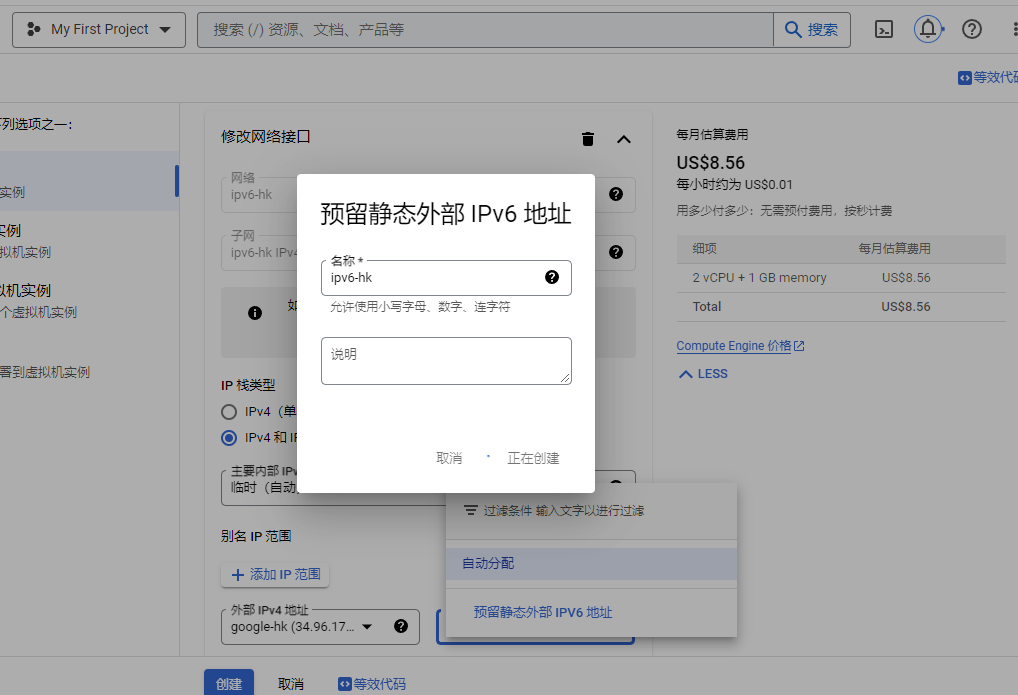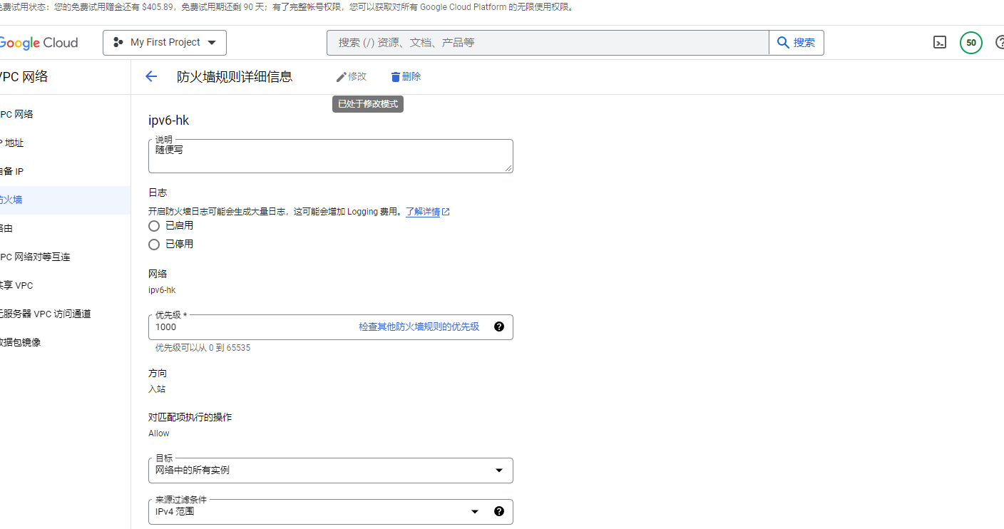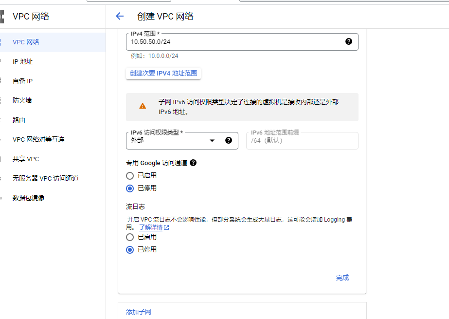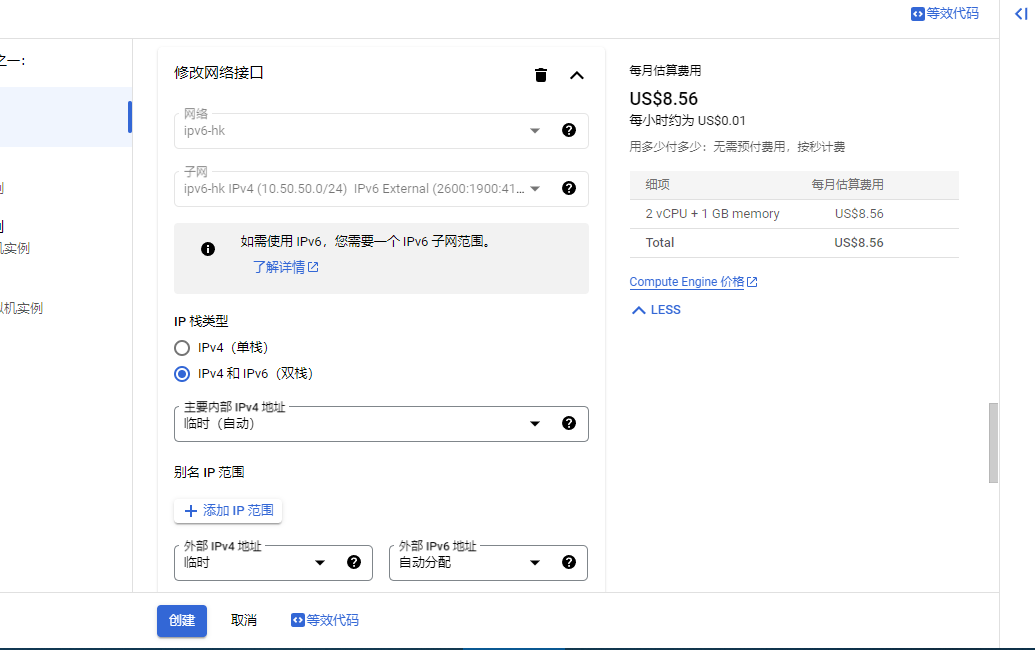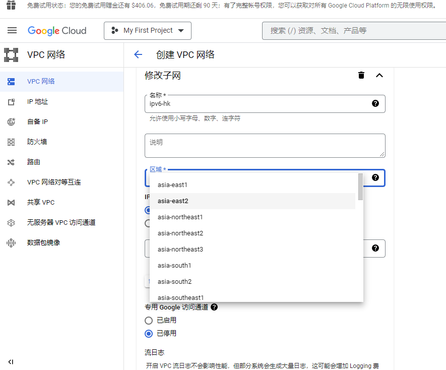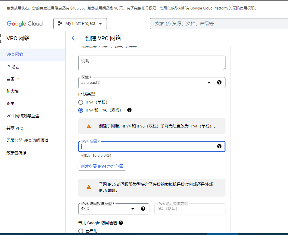 现在位置: 首页 / 技巧 / 正文 google cloud如何开启ipv6 yzhpxd 技巧 2023-07-13 97热度 0评论 哈哈,一边一边写,防止以后忘了 1、打开VPC网路 2、创建vpc 3、添加子网 这个要去你想开的实例查找下区域,香港就是asia-east2 这里是指ipv4的内部网址分配,按照格式随便写10.0.0.0/24,10.50.50.0/24,随便写 点击创建 好了,创建实例,当然ipv6好像也没啥卵用,免费的必须给上 4、创建实例 选择最便宜,免费的硬盘,搭梯子没必要高配置,等会建个高性能的平时用用 还有一点,要设置ipv6的防火墙
